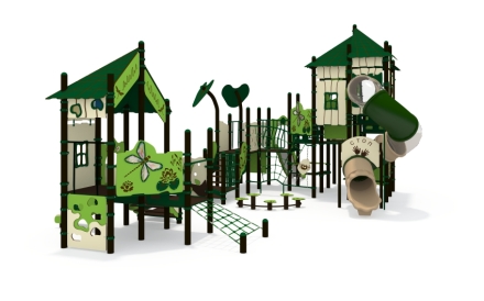 Большой насыщенный игровой комплекс на криволинейных опорах. Состоит из двух игровых домиков, содержит три разные горки: малышковую, прямую и винтовую, а также канатные и металлические лазалки, мостик и степы-кувшинки.