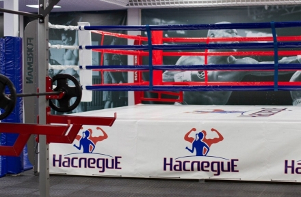 Подушки и канаты ринга окрашены в синий и красный цвет согласно требованиям Всемирной ассоциации.
