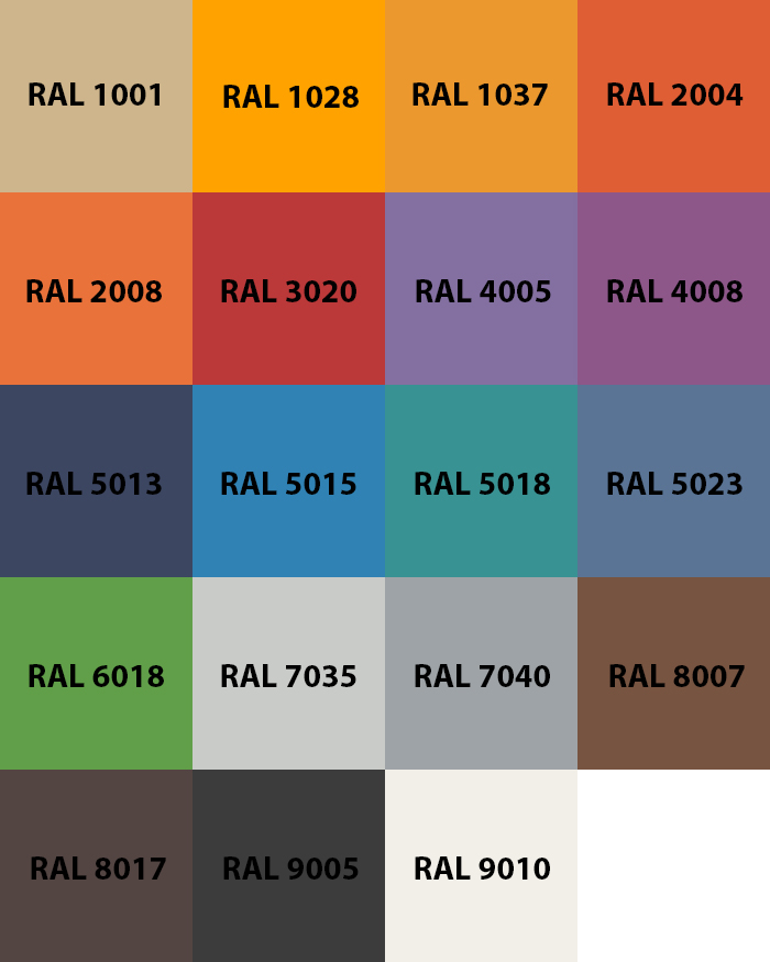 Возможно изготовление оборудования без удорожания в следующих цветах по таблице RAL: